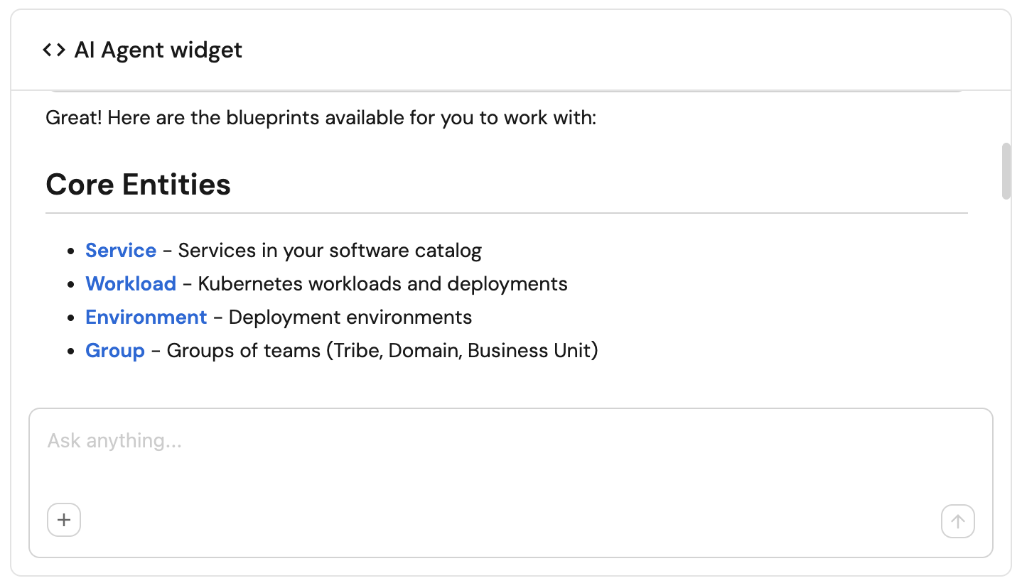 The AI Agent widget provides an interactive chat interface that helps you work with Port. You can ask questions and get assistance with various tasks in your software catalog.