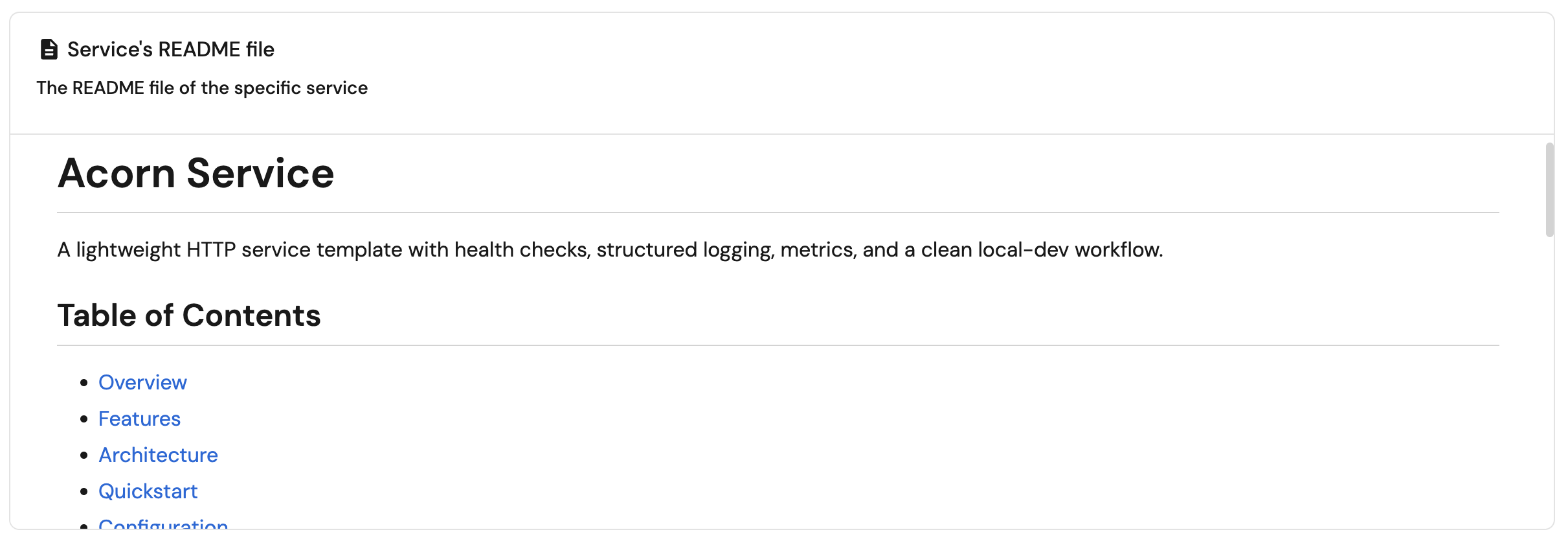 - Property: display markdown content from a specific entity's markdown property. This is useful for displaying entity-specific documentation, such as a service's README file. The content is read-only in the widget and cannot be edited directly from the widget. To update the content, you need to edit the entity's markdown property.