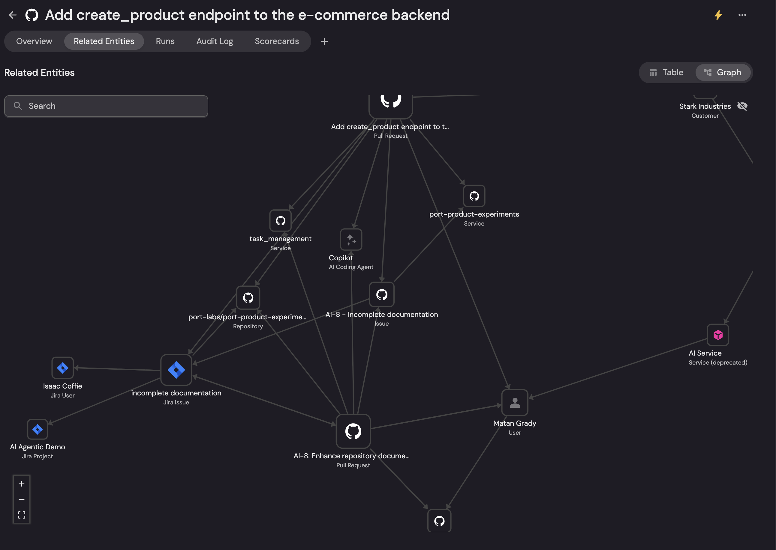 When a PR is created, it is linked to its template, Jira issues, and other related entities in your software catalog. This creates a context lake that can be used to enrich the PR description.