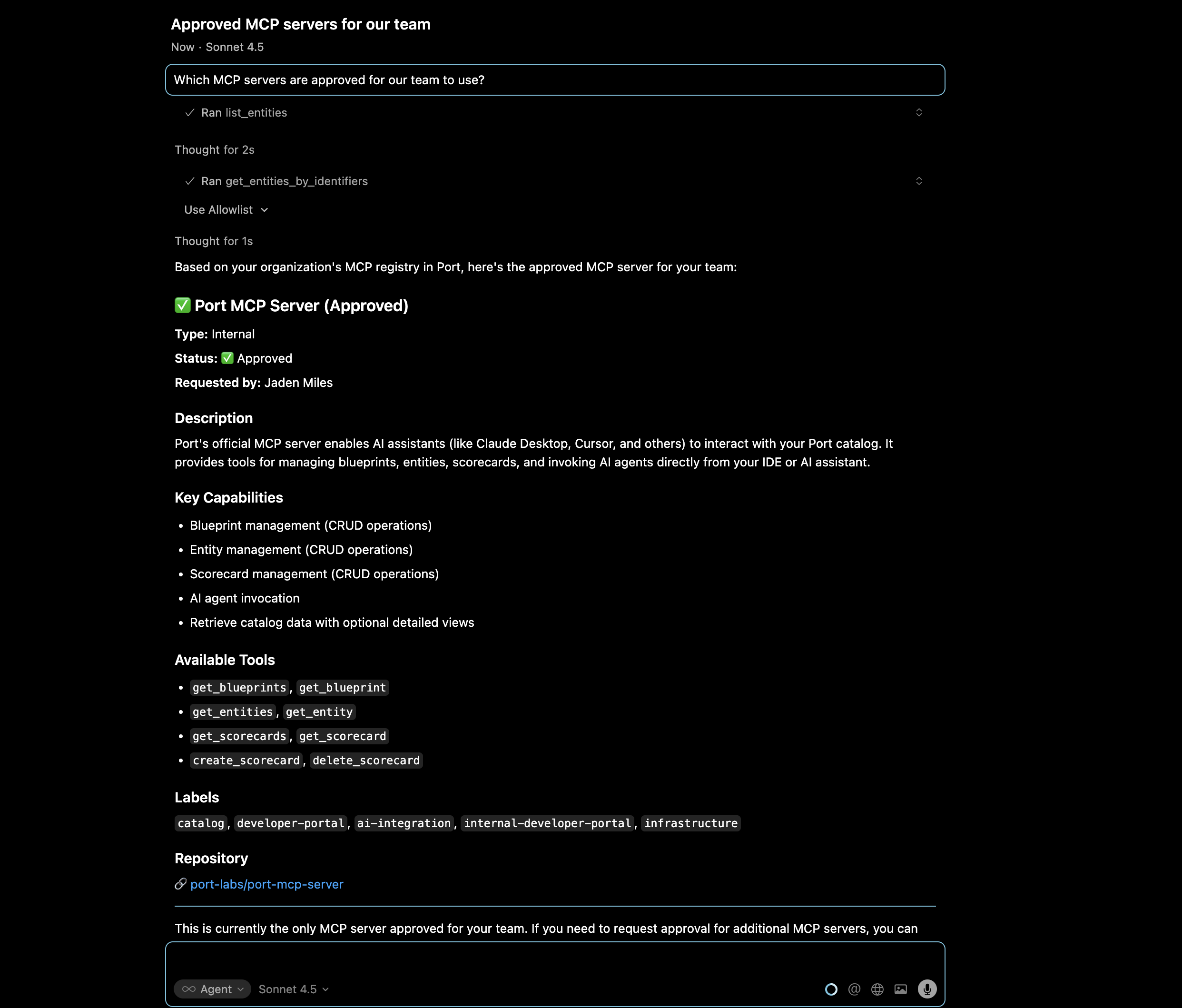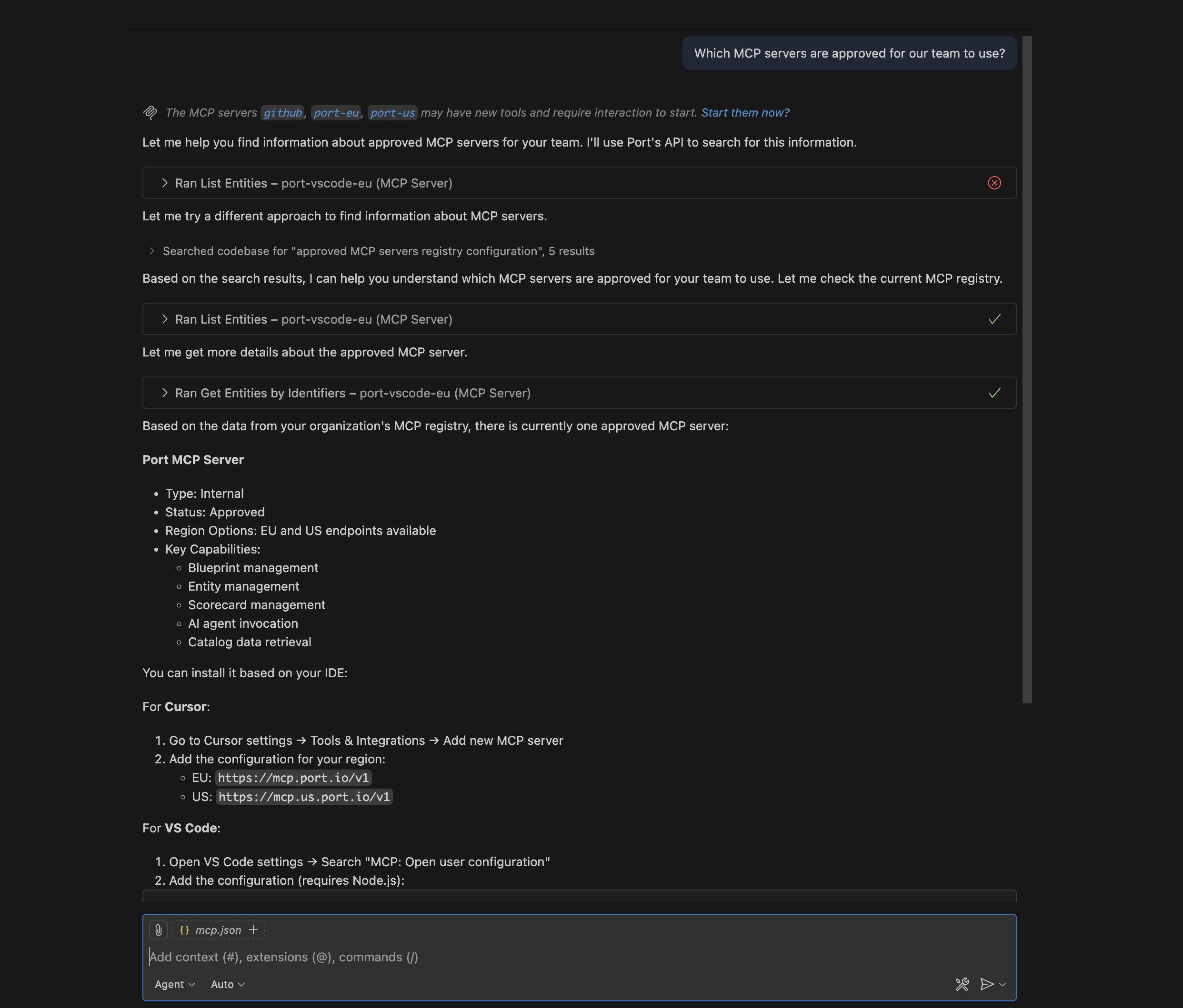Leverage Port's AI capabilities to enable intelligent discovery and recommendations for MCP servers. With your MCP server registry in Port, you can use Port AI to answer questions like: