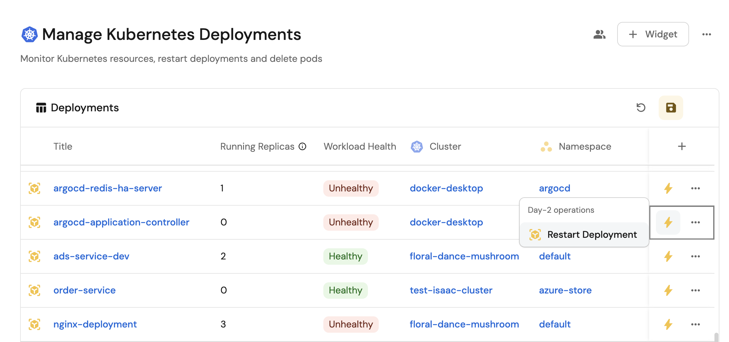 - Set up self-service actions to manage Kubernetes deployments and pods (restart deployment and delete pod).