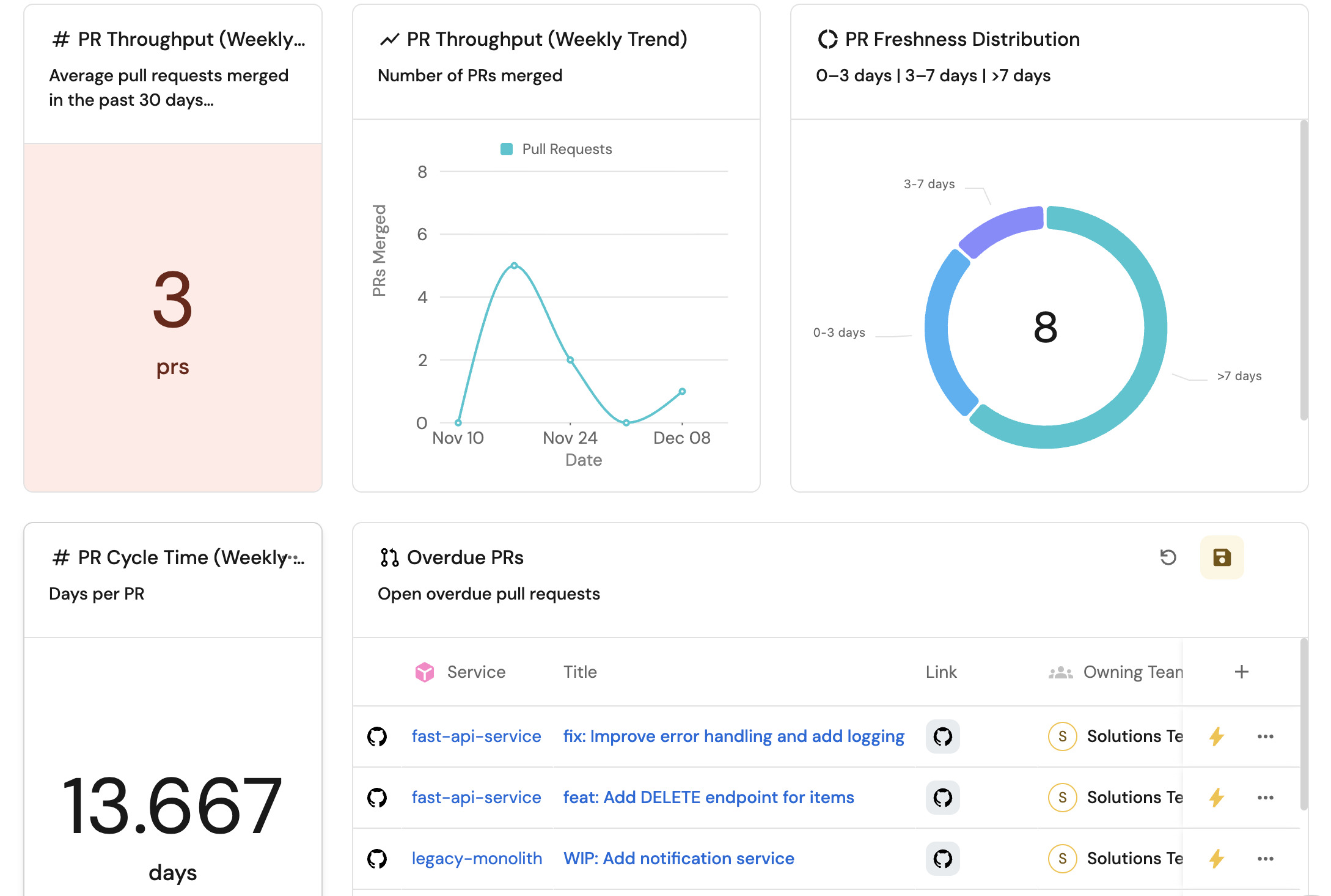 - Overdue PRs (open > 3 days) - Signals workflow inefficiencies, unclear ownership, or blocked work.