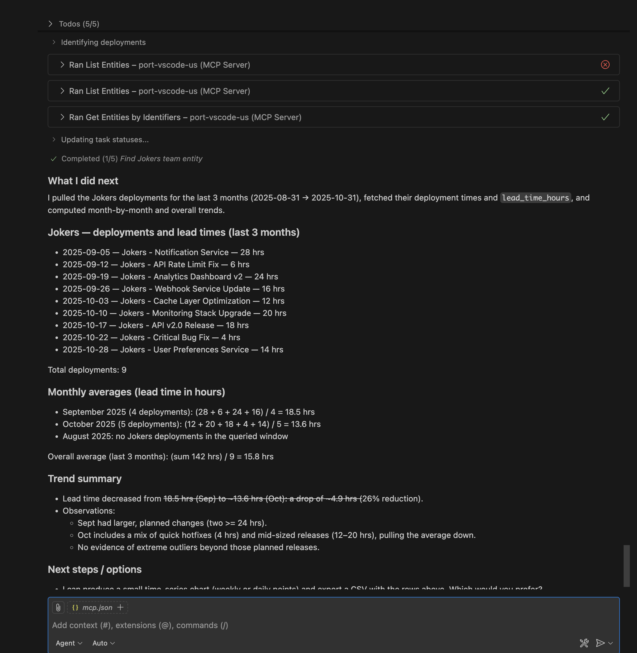 This guide demonstrates how to use Port's Model Context Protocol (MCP) server to query DORA metrics using natural language commands directly from your IDE or AI-powered tools. By leveraging the MCP server, you can access deployment frequency, lead time, change failure rate, and mean time to recovery data without leaving your development environment.