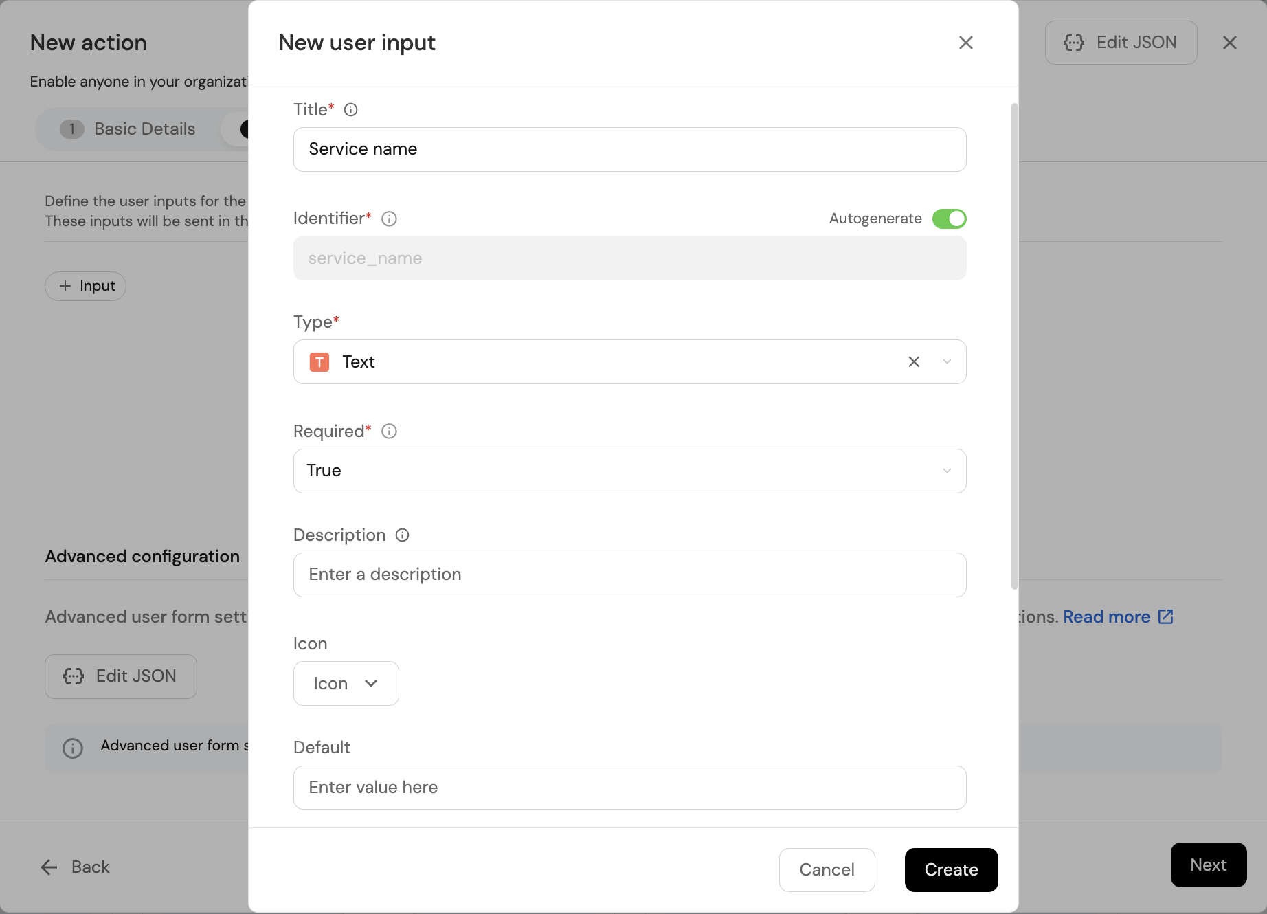Service nameas the Title, selectTextfor the Type, set Required toTrue, and click on theCreatebutton.
