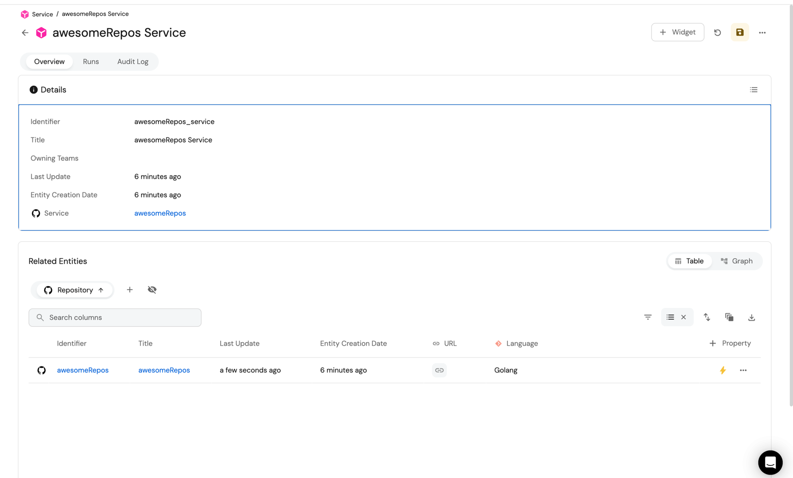 Head over to the service catalog and you will see a microservice entity created with the repository linked to it: