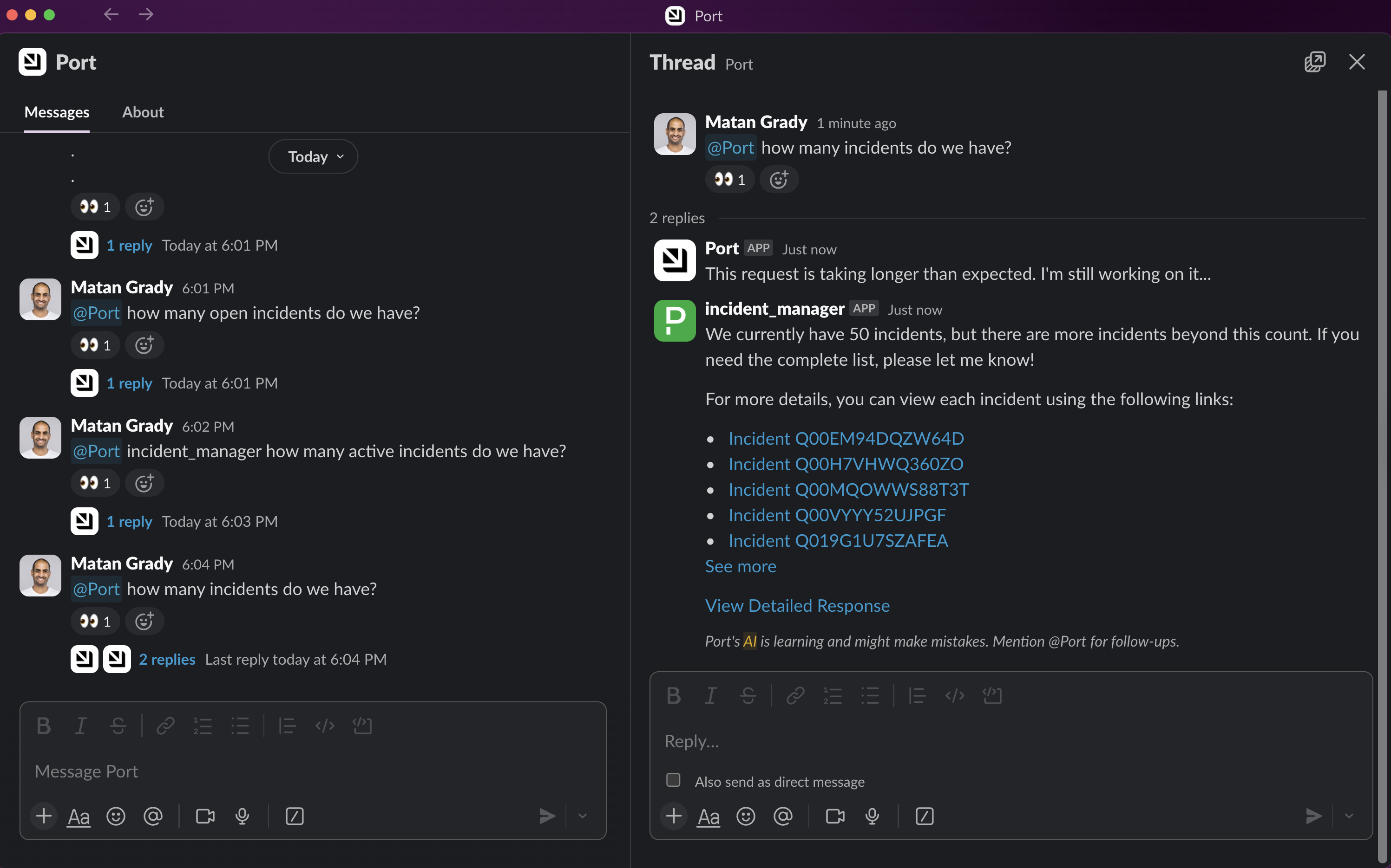 The Slack integration provides a natural way to interact with the Incident Manager agent. Before using this method, ensure you have installed and configured the Port AI Assistant Slack App.