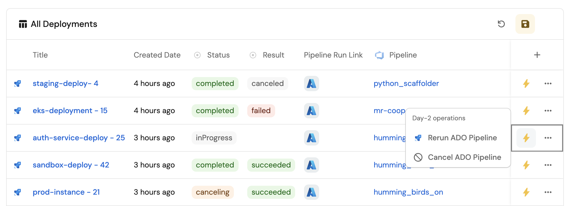 - Set up self-service actions to manage deployments (trigger, retry, and cancel).