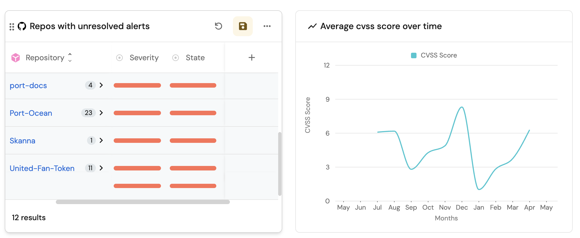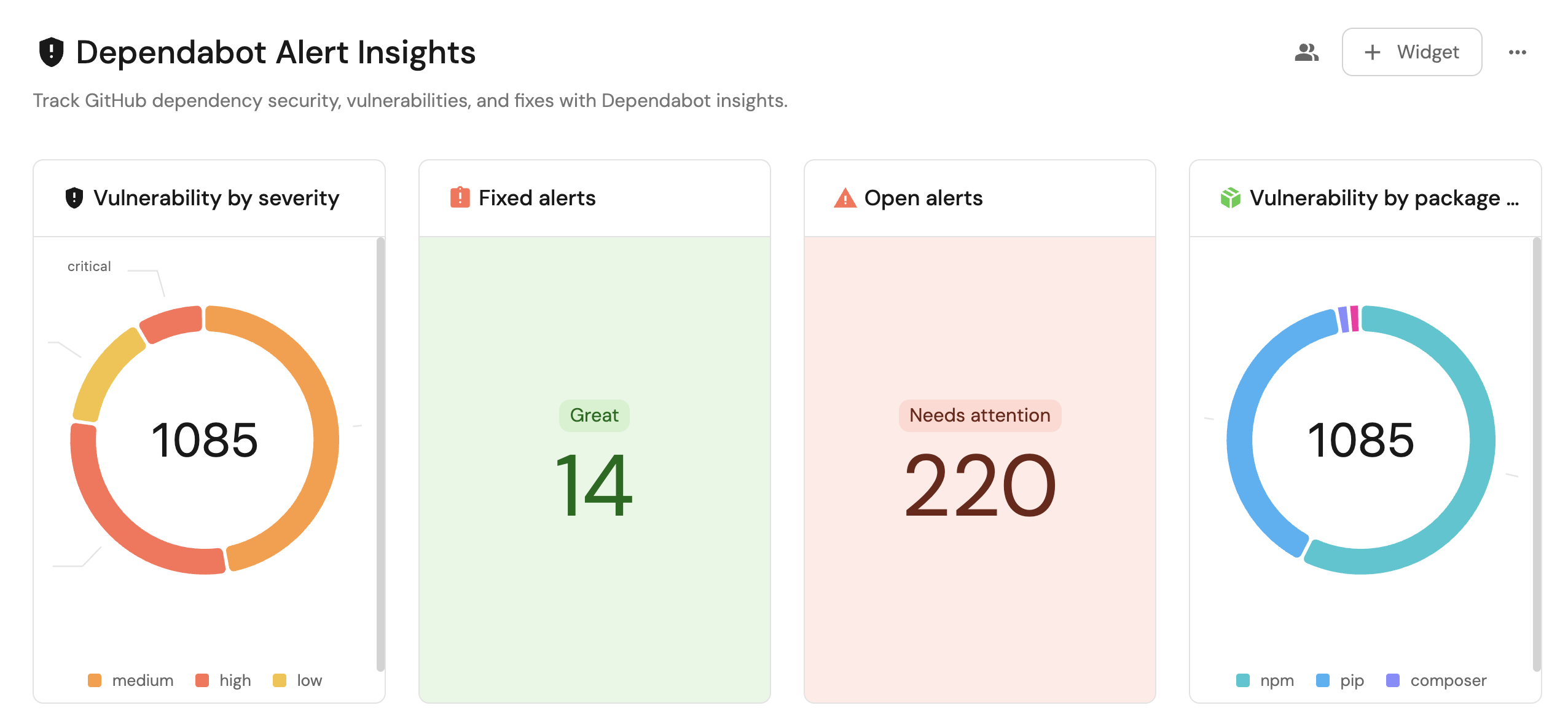 Once the GitHub data is synced, we can create a dedicated dashboard in Port to monitor and analyze dependency vulnerability alerts using customizable widgets.