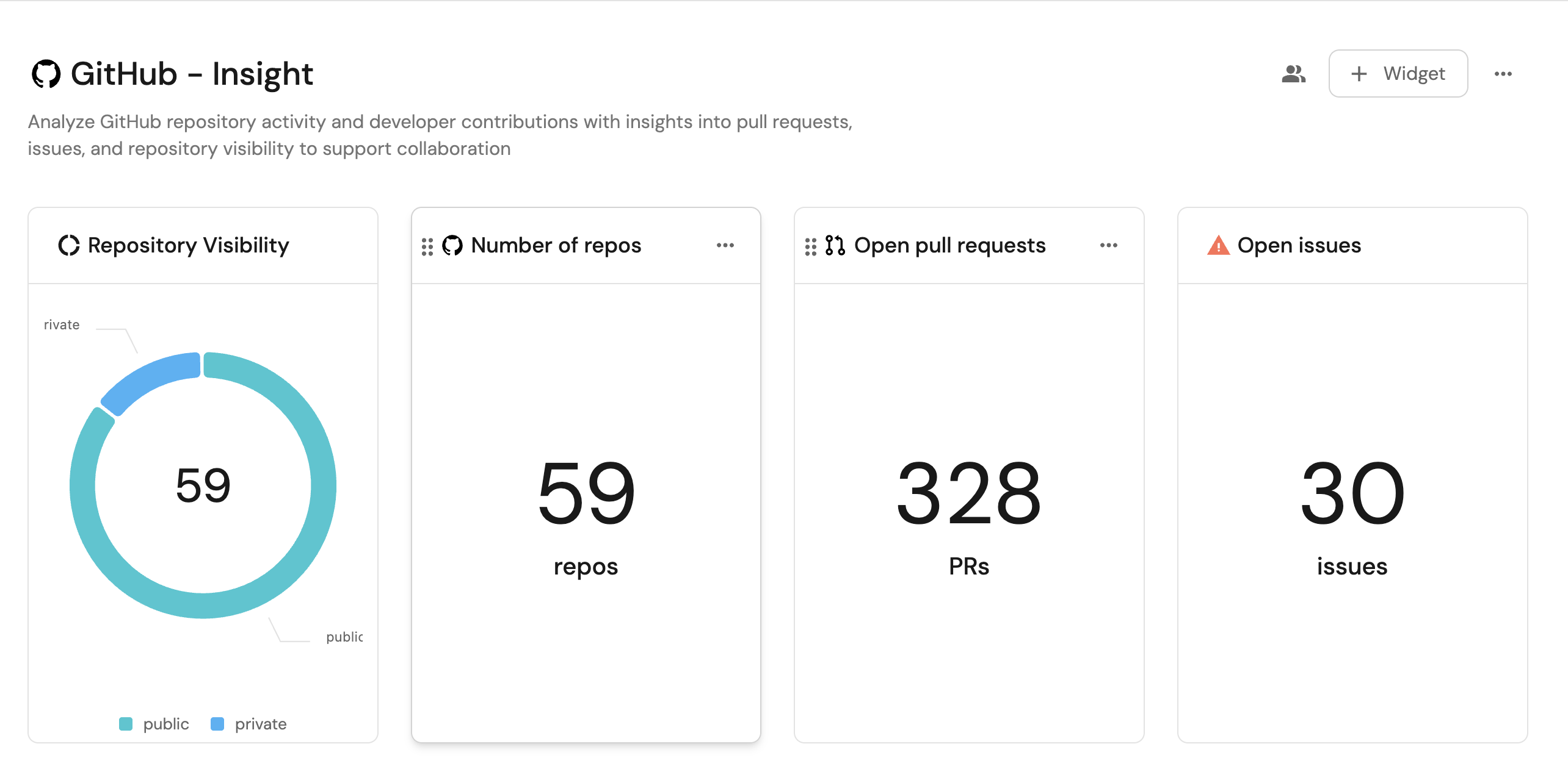 Once the GitHub data is synced, we can create a dashboard and add widgets to monitor repository visibility and developer activity.
