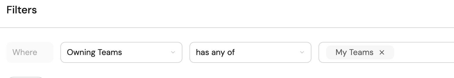 By using the My Teams filter you will only see entities that belong to one of your teams. This means you will only see entities from teams that you are a member of.