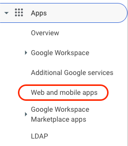 - In the Google Admin Console, in the sidebar menu, navigate to Apps -> Web and mobile apps: